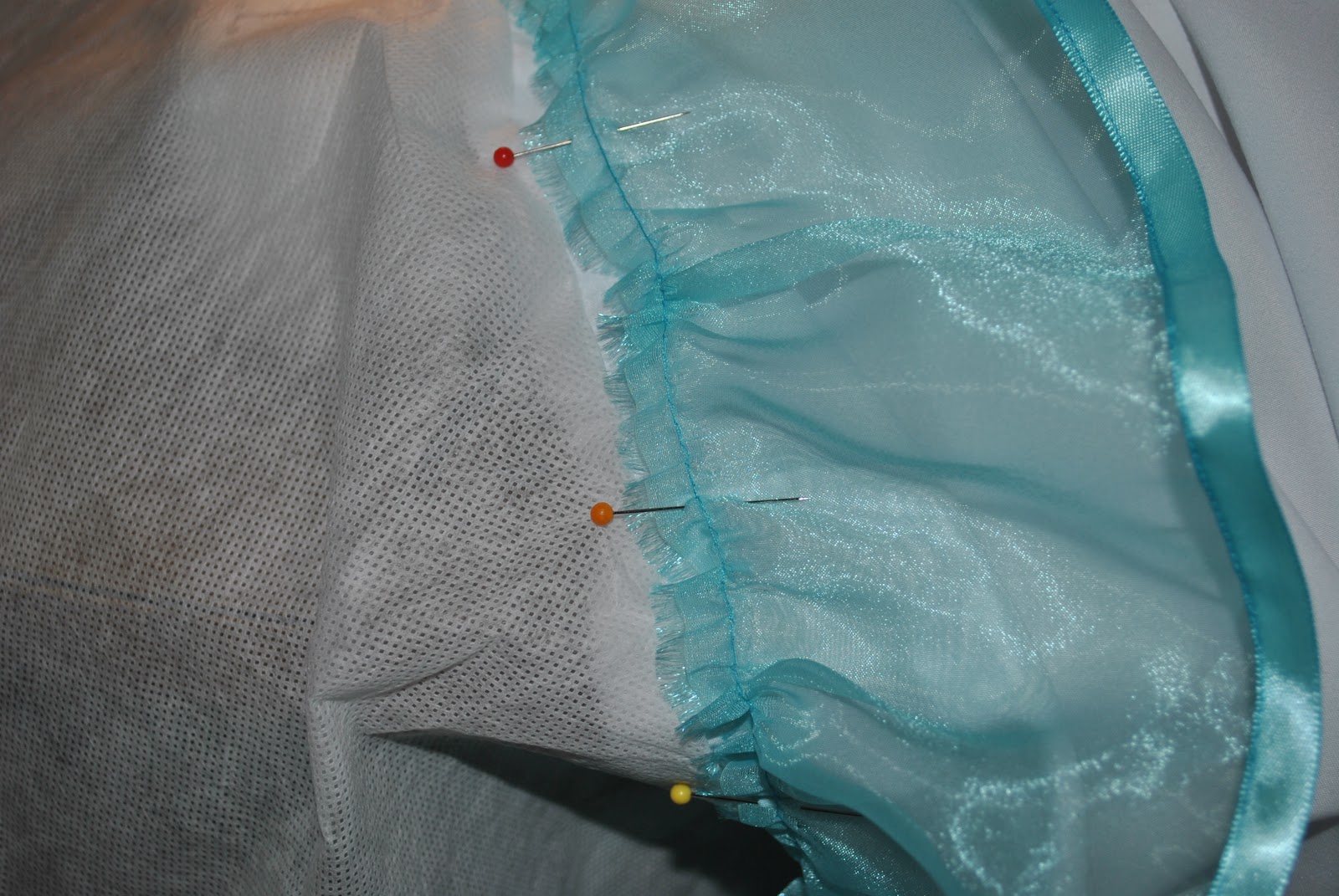 Next, I pinned the first ruffle to the bed skirt I got from Walmart and started sewing. I used white, but I think I would use a color next time. The white kind of "glows" through the sheer fabric.